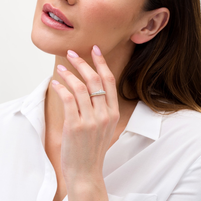 This regal style is crafted in sterling silver and warm 10K gold, with a silver-tone diamond tiara design topped by a roped ribbon – finished in polished yellow gold. This look features 1/4 carat diamonds for a dazzling shine. This ring is only available in size 7. Sterling silver rings cannot be resized after purchase.